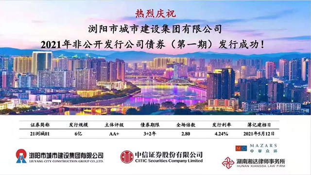 5月12日,瀏發(fā)集團子公司瀏陽城建集團2021年非公開發(fā)行公司債券(第一期)成功發(fā)行,發(fā)行規(guī)模6億元,期限3+2年,發(fā)行利率4.24%,創(chuàng)下了公司歷年來私募產品票面利率新低。