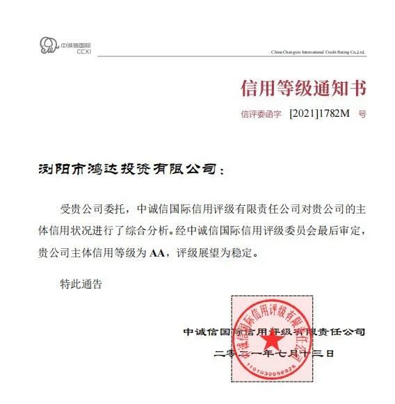 7月13日,國內權威信用評級機構中誠信國際授予瀏發集團二級子公司鴻達投資有限公司主體信用等級AA評級,評級展望為穩定。