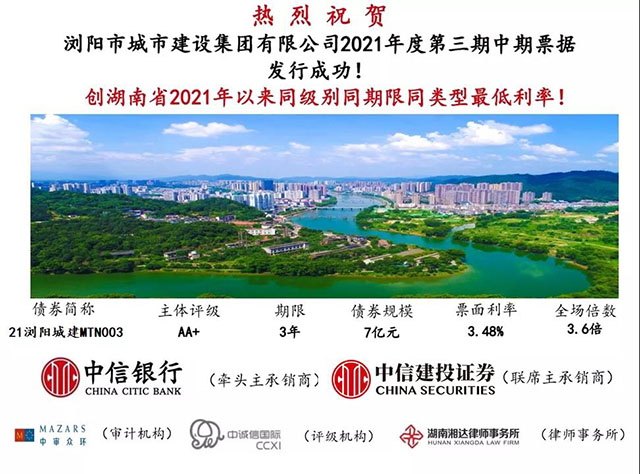 8月5日,瀏發(fā)集團(tuán)子公司瀏陽城建集團(tuán)2021年度第三期中期票據(jù)成功發(fā)行,發(fā)行規(guī)模7億元,期限3年,票面利率為3.48%,創(chuàng)湖南省2021年以來同級(jí)別、同期限、同類型最低利率!