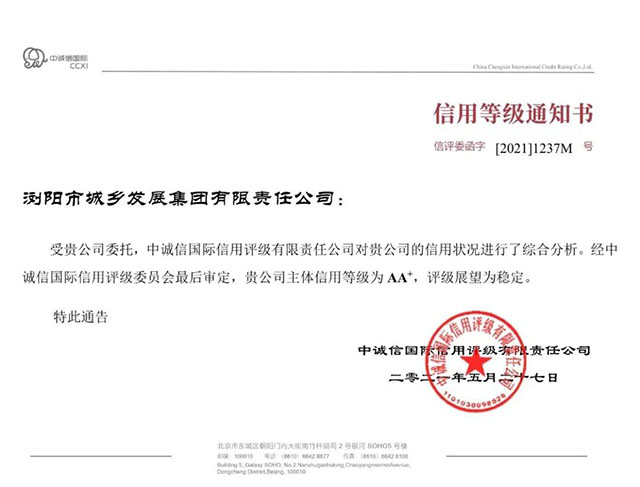 5月31日,經國內權威信用評級機構中誠信國際評定,瀏發集團獲評主體信用等級“AA+”,評級展望為“穩定”,實現了瀏陽國有企業在信用評級上的又一重大突破,具有里程碑意義。