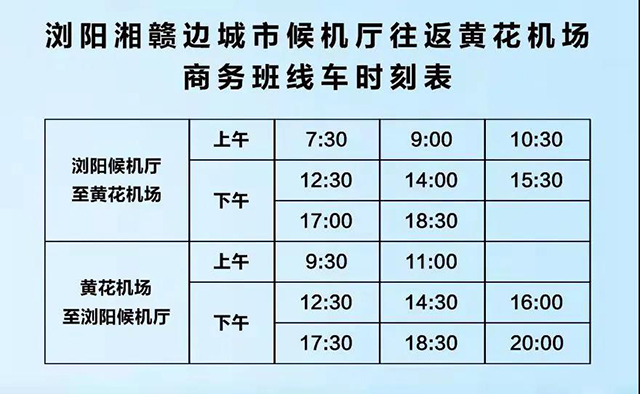 自2021年11月26日起,瀏陽湘贛邊城市候機廳至黃花國際機場往返客運班線恢復運營,具體班次如下: