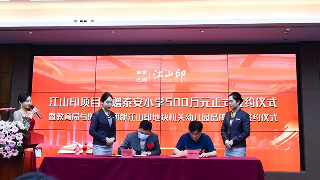 江山印項目是瀏發集團2020年通過水佳片區招商引進的重大商業綜合體項目。在此次簽約活動上,江山印還與泰安小學簽署了捐贈協議——江山印向泰安小學捐贈500萬元,將用于泰安小學小區各類教材設備的購買及教學設施的完善。泰安小學由瀏發集團出資建設,總投資估算9600萬元,規劃48個教學班,項目建成后可新增學位約2160個,預計今年秋季開學時可投入使用。