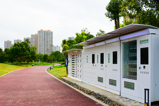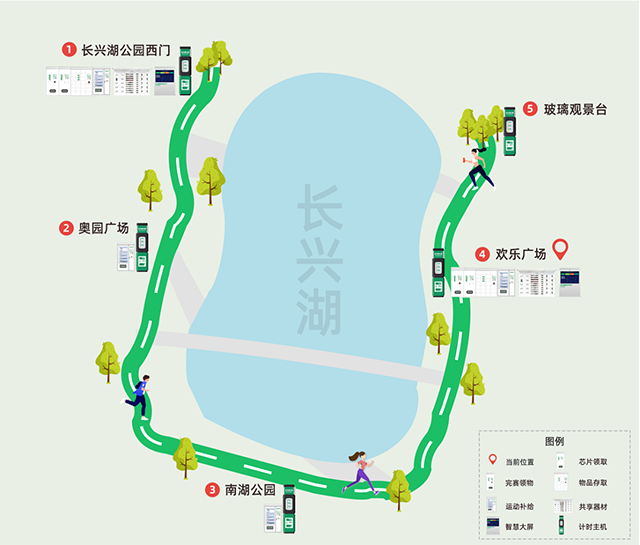 長興湖健康主題公園智慧跑道融合了5G、大數據、物聯網、云計算等智慧技術,沿途設置了5個智能計時點,每間隔500米一個,可自動記錄運動數據。其中2個為綜合服務點,可為運動者提供計時打卡、運動芯片領取、隨身物品存取、紀念品領取、運動器材租賃、運動飲品購買等多項體驗。