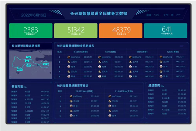 “參與者可以一邊運動,一邊實時掌握距離、時長、配速、能耗、排名等運動數據,讓運動更科學。”長興湖健康主題公園智慧跑道相關負責人介紹。