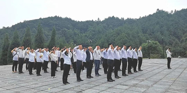 在道吾山風(fēng)景名勝區(qū)內(nèi),瀏陽烈士陵園被群山環(huán)抱,烈士紀念碑巍巍矗立。瀏發(fā)集團全體黨員面對莊嚴的紀念碑,懷著沉重的心情,默哀并行三鞠躬禮。集團黨委書記、董事長張伯鋒,黨委副書記、總經(jīng)理王輝章代表瀏發(fā)集團向英烈敬獻花籃,并整理花籃上的緞帶。