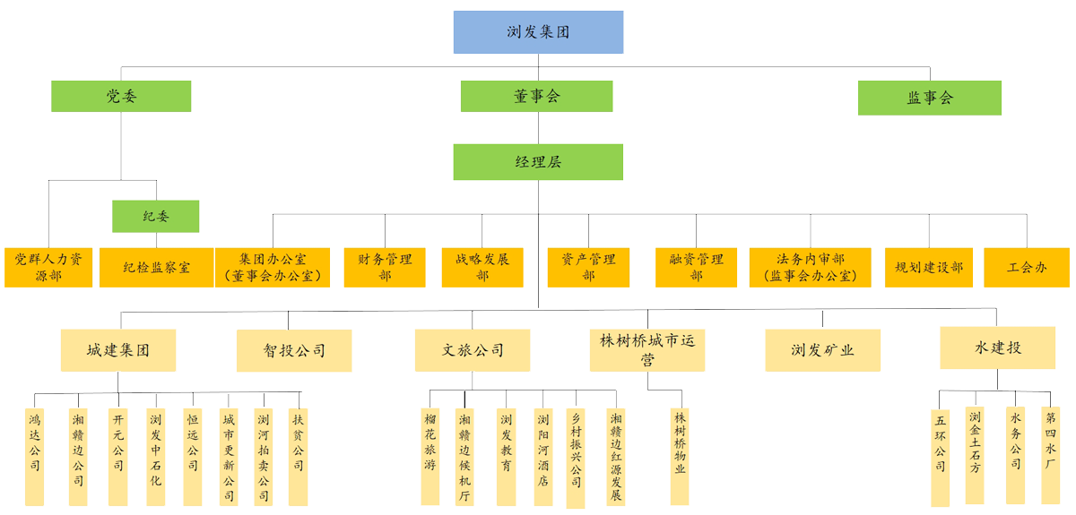 瀏陽市城鄉發展集團有限責任公司(簡稱“瀏發集團”)成立于2020年3月,2020年5月18日正式掛牌運營,是瀏陽市委、市政府組建的國有獨資企業。公司注冊資金100億元,現有總資產889億元,信用等級AA+,是以瀏陽市城市建設集團有限公司、市水利建設投資有限公司、市文化旅游產業發展有限責任公司為主體組建的市屬投資管理類企業集團。 公司按照“政府引導,市場運作”的原則,深耕城市運營、城市建設、文旅投資、產業投資、鄉村振興等五大業務板塊。公司下屬二級公司6個(城建集團、水建投、文旅公司、瀏發礦業、株樹橋城市運營(管理物業公司)、智投公司);全資三級公司16個(鴻達公司、湘贛邊公司、恒遠公司、城市更新公司、瀏河拍賣公司、扶貧公司、榴花旅游、瀏發教育、瀏陽河酒店、鄉村振興公司、紅源實業、五環公司、水務公司(管理第四水廠)、瀏金渣土、瀏金土石方);控股三級公司3個(開元公司(管理瀏發中石化)、湘贛邊候機廳)。