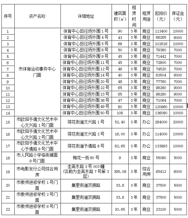 受瀏陽市體育運動事務中心、瀏陽市歐陽予倩文化藝術中心等單位委托,根據國有資產管理的相關規定,我公司定于2021年1月13日上午10:00在瀏陽市城鄉發展集團有限責任公司8樓會議室,對位于瀏陽市荷花街道文興路與予倩路、梅花一街80號等22處資產面向社會進行公開拍租,標的情況見下表: