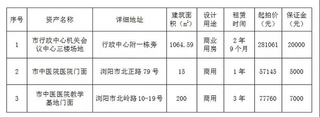 受瀏陽市機(jī)關(guān)后勤服務(wù)中心和瀏陽市中醫(yī)醫(yī)院?jiǎn)挝晃?,根?jù)國(guó)有資產(chǎn)管理的相關(guān)規(guī)定,我公司定于2021年4月1日上午10:00在瀏陽市城鄉(xiāng)發(fā)展集團(tuán)有限責(zé)任公司8樓會(huì)議室,對(duì)位于瀏陽市行政中心北部樓群東側(cè)機(jī)關(guān)會(huì)議中心三樓場(chǎng)地等資產(chǎn)面向社會(huì)進(jìn)行公開拍租,標(biāo)的情況見下表: