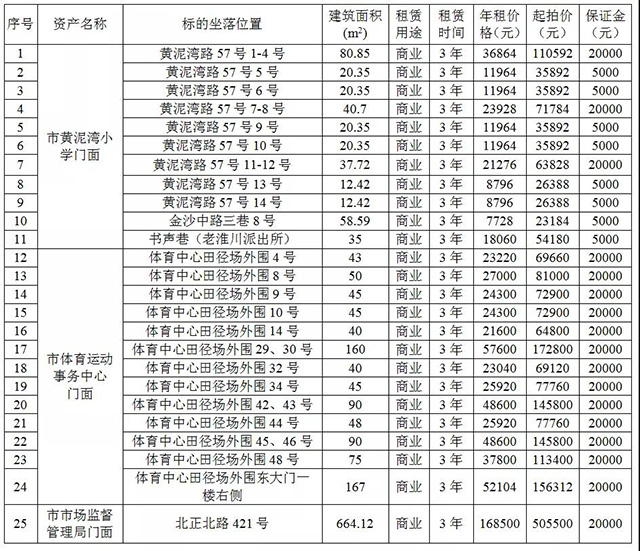 受瀏陽市黃泥灣小學(xué)和瀏陽市體育運(yùn)動(dòng)事務(wù)中心、瀏陽市市場(chǎng)監(jiān)督管理局等單位委托,根據(jù)國(guó)有資產(chǎn)管理的相關(guān)規(guī)定,長(zhǎng)沙市瀏河拍賣行定于2020年9月29日上午10:00在瀏陽市財(cái)會(huì)學(xué)校四樓多功能廳,對(duì)位于瀏陽市黃泥灣路、北正北路、體育中心田徑場(chǎng)外圍等25處門面面向社會(huì)進(jìn)行公開拍租,標(biāo)的情況見下表: