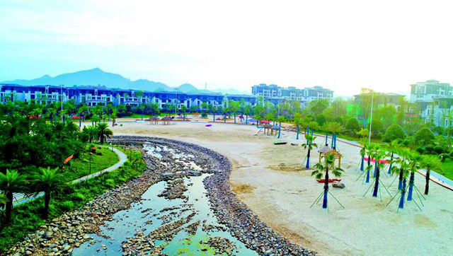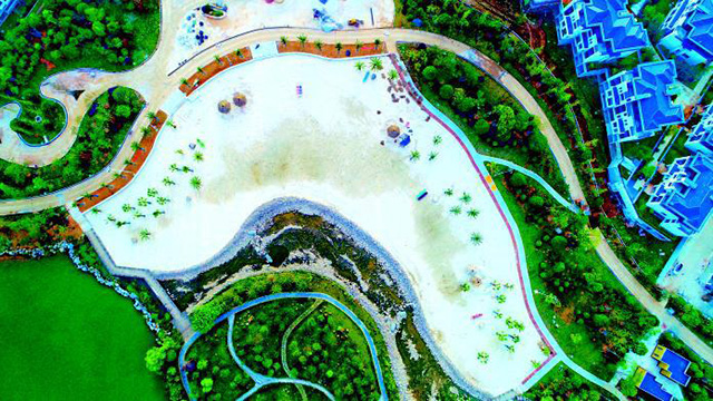 陽光沙灘,細膩又柔和,沙灘上建有6個休閑亭,周圍一棵棵棕櫚樹隨風搖曳,鵝卵石遍布,大大小小、白白凈凈、錯落有致;水石相依,沙石一體,沙灘與風光帶形成了一道別致的景觀,令人心曠神怡。