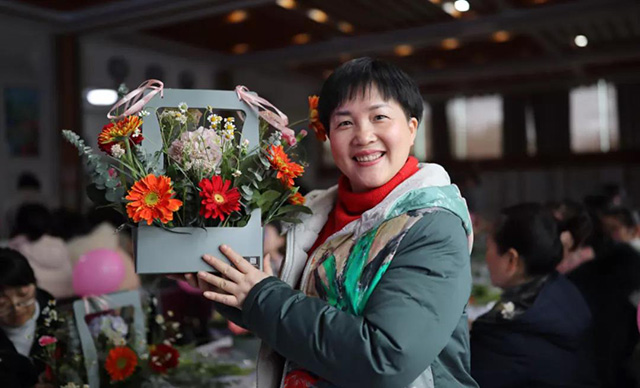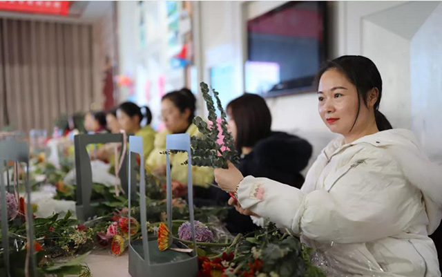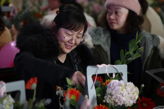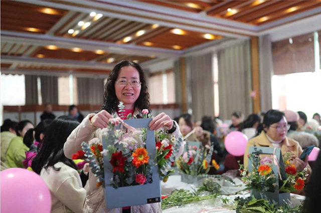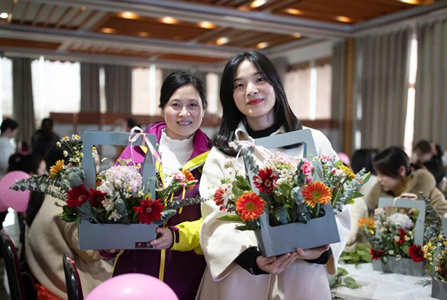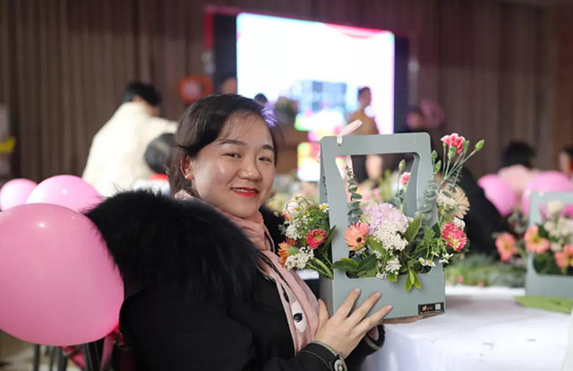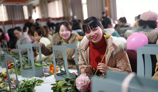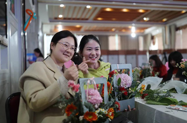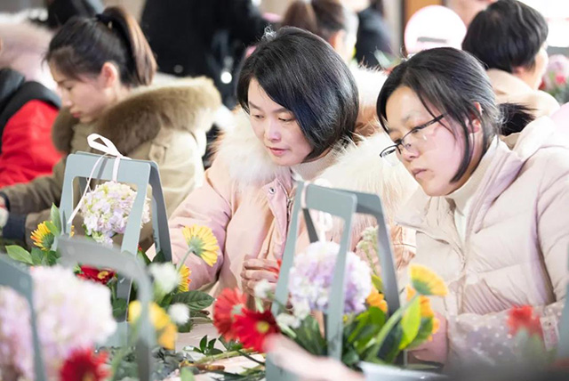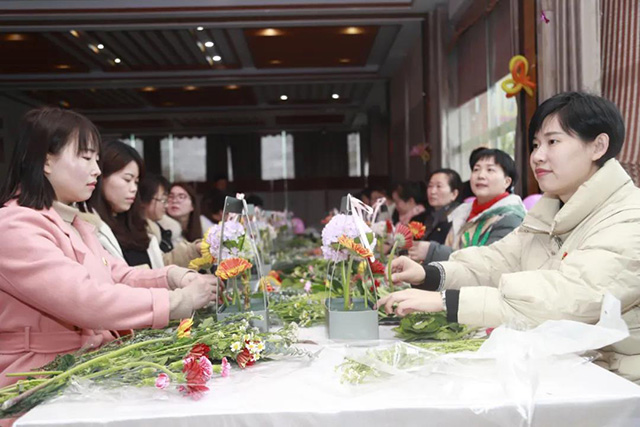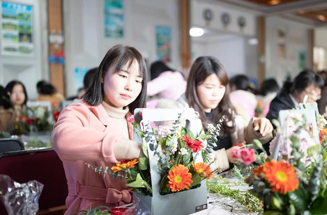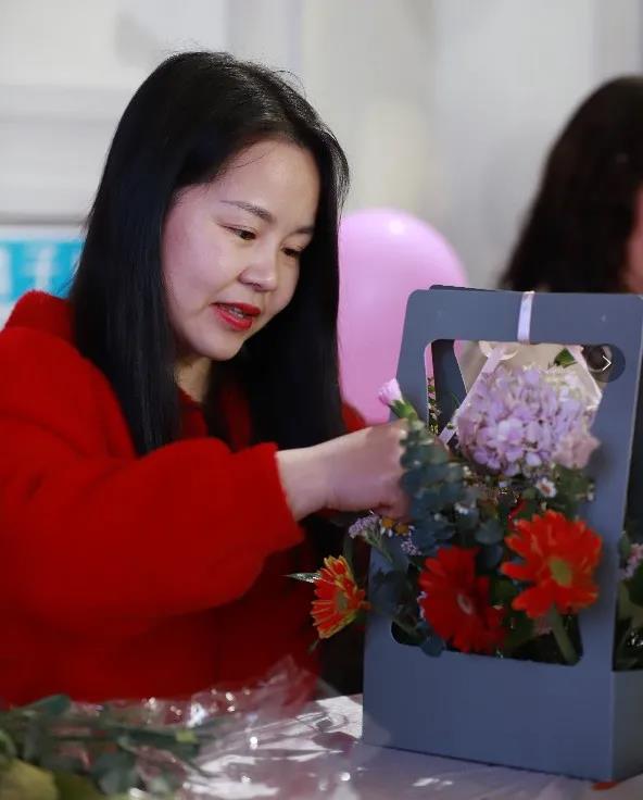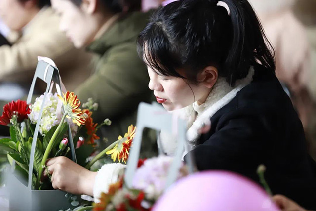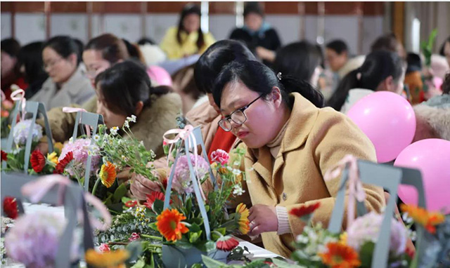 在專業花藝師的帶領下,女同胞們饒有興致地修枝剪葉,沉浸在花藝創作的浪漫氛圍中。