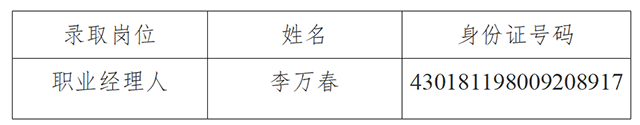 瀏陽市健翔體育有限公司職業經理人的面試、綜合考察、體檢等工作已經結束,現將擬錄用人員名單公示如下: