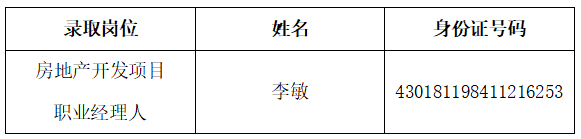 瀏陽市恒遠建設開發有限公司公開招聘房地產開發項目職業經理人資格審查、筆試、面試、體檢、綜合考察工作均已經結束,現將擬錄用人員名單公示如下:
