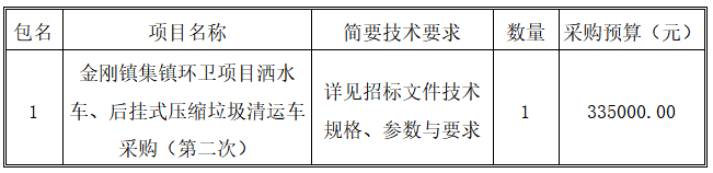 金剛鎮(zhèn)集鎮(zhèn)環(huán)衛(wèi)項(xiàng)目灑水車、后掛式壓縮垃圾清運(yùn)車采購(gòu)(第二次)